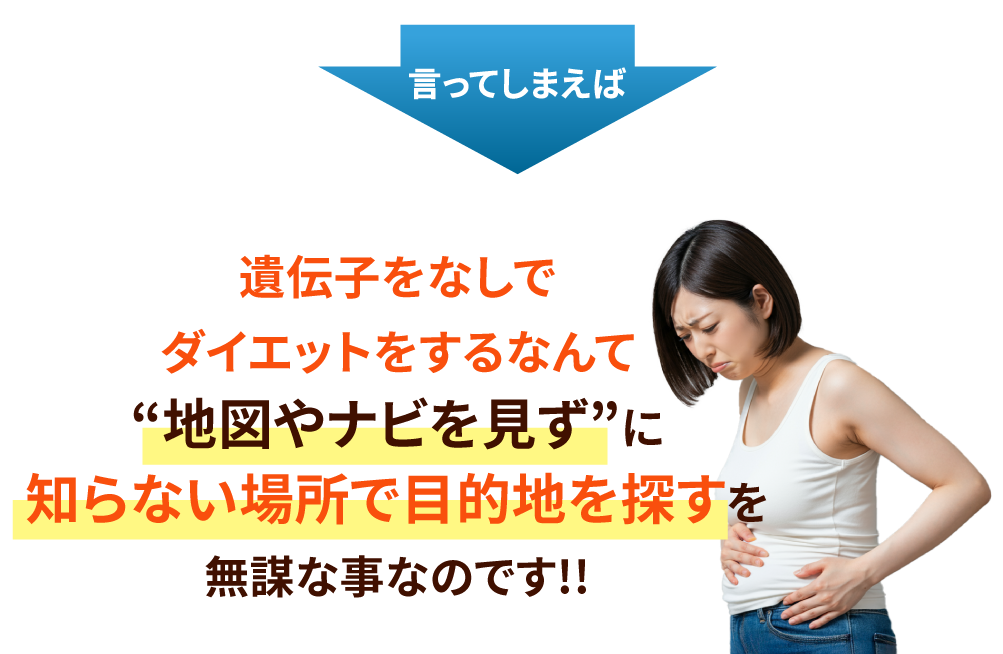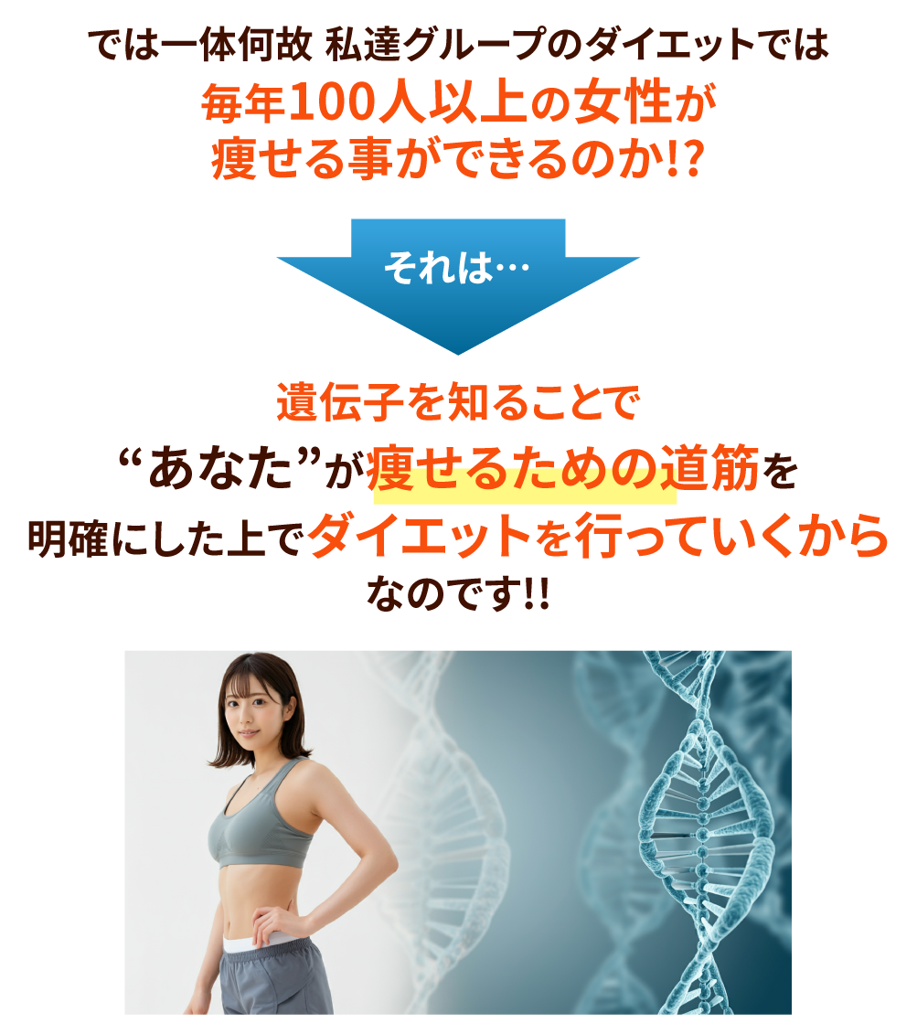 遺伝子には1人の人間の情報がすべて書き込まれている、と言われるほど沢山の情報が詰まっています。つまり・・・遺伝子を知ることができれば、あなたがどんな方法を取れば痩せやすいのか、あなたがどんな食事をすれば痩せやすいのか、が明確に分かるようになるのです!